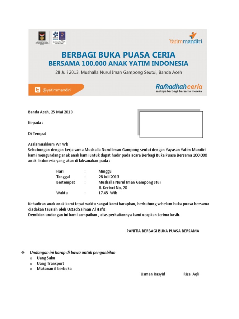 Surat Undangan Anak Yatim - Download masjid baitul jannah rw perum permata tangerang format 719 x 999 pixel. Bapak/ibu di tempat assalamualaikum warahmatullahi wabarakatu.