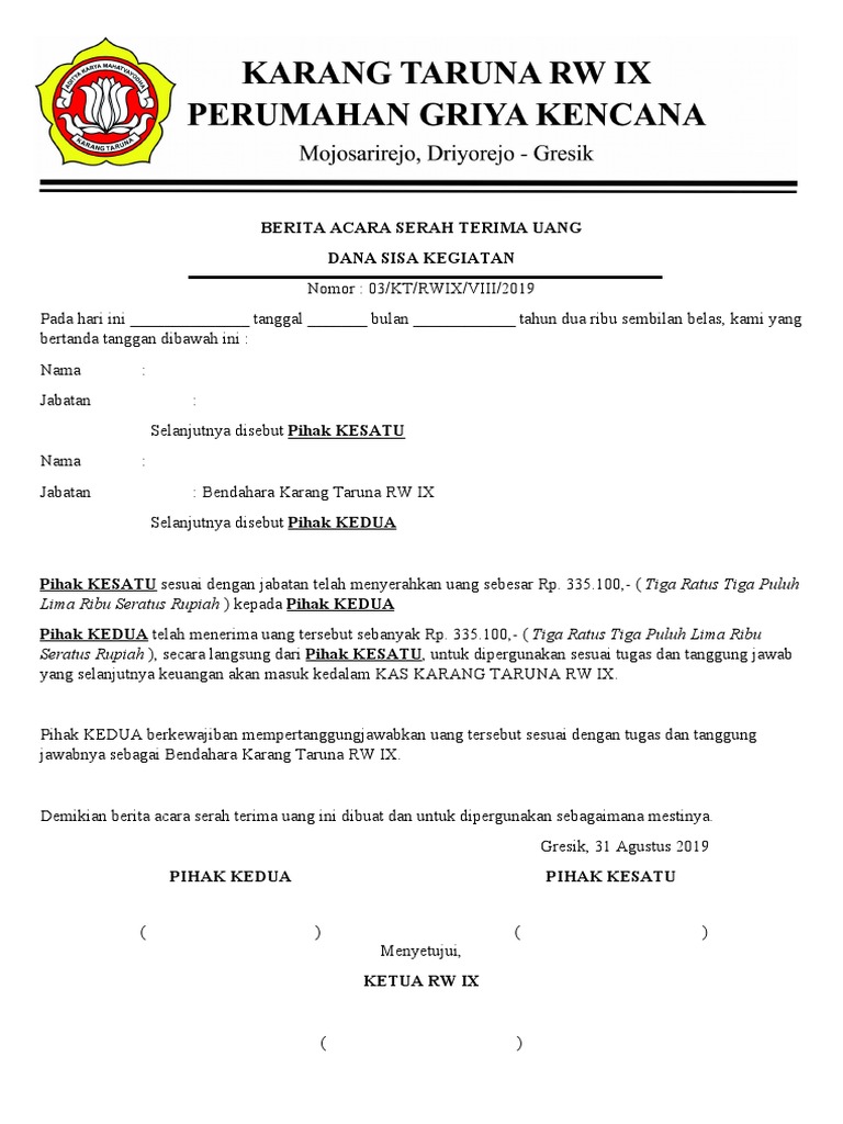 Contoh Surat Serah Terima Uang Kas - Berbagi Contoh Surat