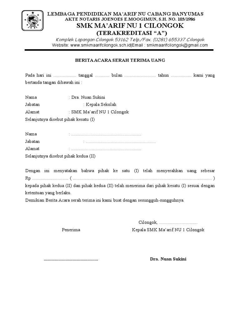 Contoh Surat Berita Acara Serah Terima Uang - Nusagates
