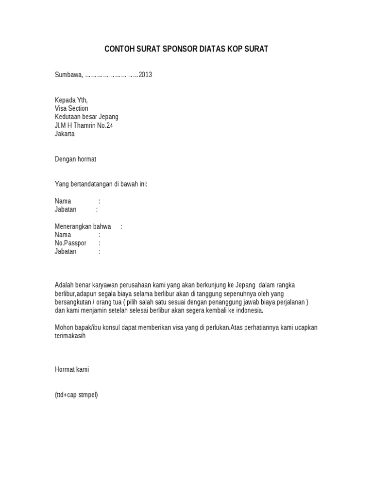 Semoga contoh surat ini dapat menjadi referensi dalam menulis surat sponsor visa yang resmi. Contoh surat sponsor visa ke jepang untuk berbagai keperluan sebagai referensi dalam menulis surat sponsor visa yang resmi dan ditulis dalam bahasa inggris. The collection that comprising chosen picture and the best among others.