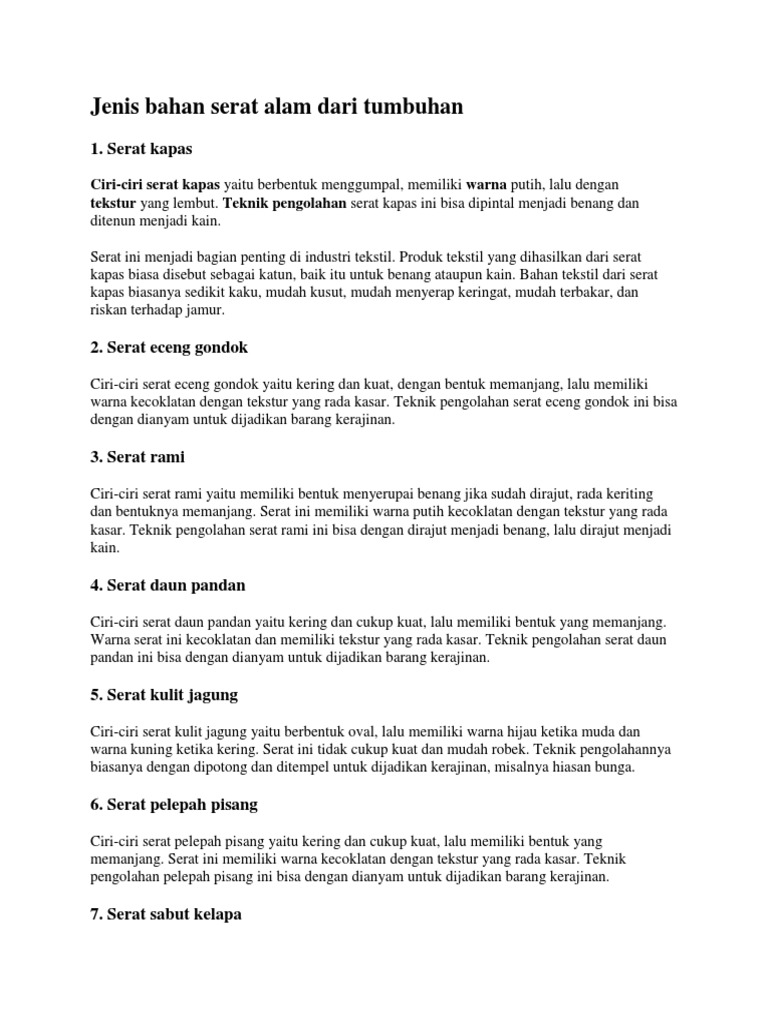 Jenis bahan serat alam menjadi bagian penting dalam industri tekstil. Menggiling kapas, yaitu memisahkan kapas dari bijinya musoni, yaitu mengurai kapas yang sudah digiling, kemudian digulung ngantih, yaitu memintal benang yang dihasilkan dari gulungan kapas. Teknik pengolahan serat kapas secara singkat!