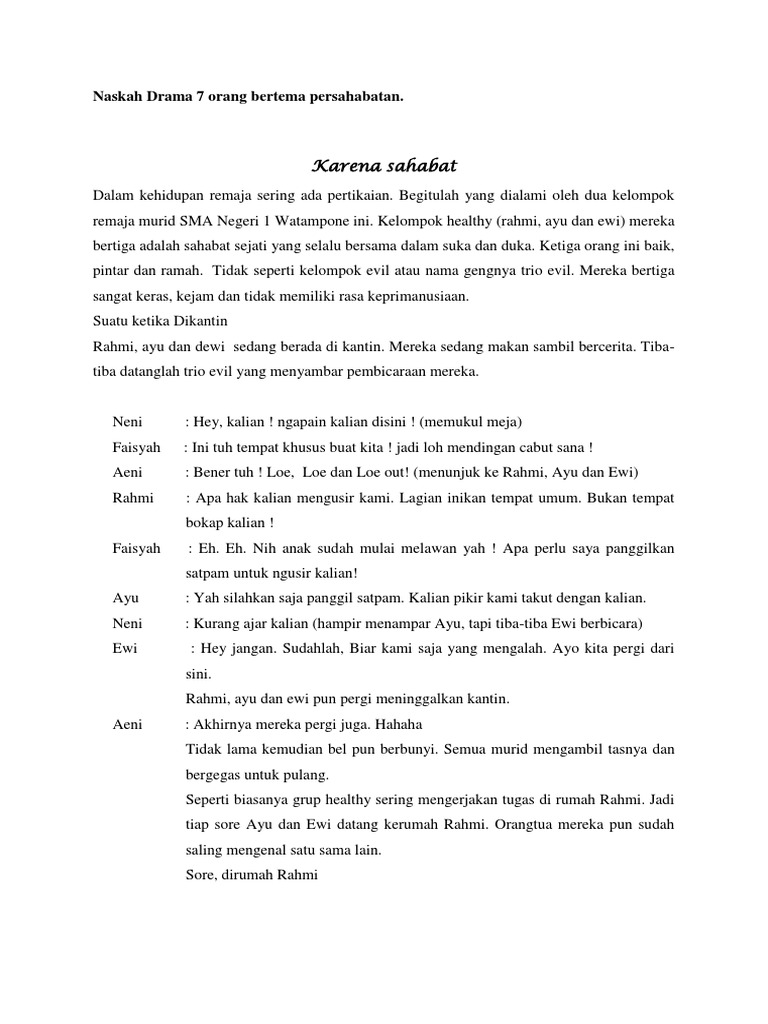 Lihat bawah untuk cerita : Teks drama 7 orang tema persahabatan docx document. Karena sahabat dalam kehidupan remaja sering ada pertikaian.