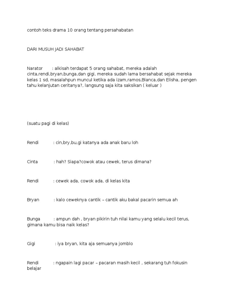 Contoh teks drama 10 orang tentang persahabatan dari musuh jadi sahabat narator : Jika benar, maka contoh dialog drama dibawah ini diharapkan bisa memberi masukan yang bermanfaat bagi sahabat pembaca. Teks drama 10 orang agustus (1) april (4).