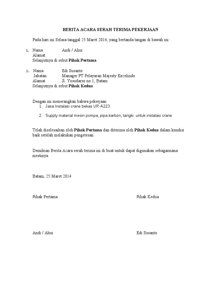 Berita Acara Serah Terima Pekerjaan Pekerjaan Pasang Crane Pdf