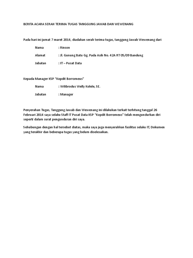 Ruko edelwis permai blok ab3 no. Semoga berita acara serah terima pekerjaan ini dapat bermanfaat bagi anda yang membutuhkannya. Berikutnya yaitu format surat serah terima pekerjaan karena keluar dari tempat kerja, atau bisa juga disebut surat pengunduran diri.