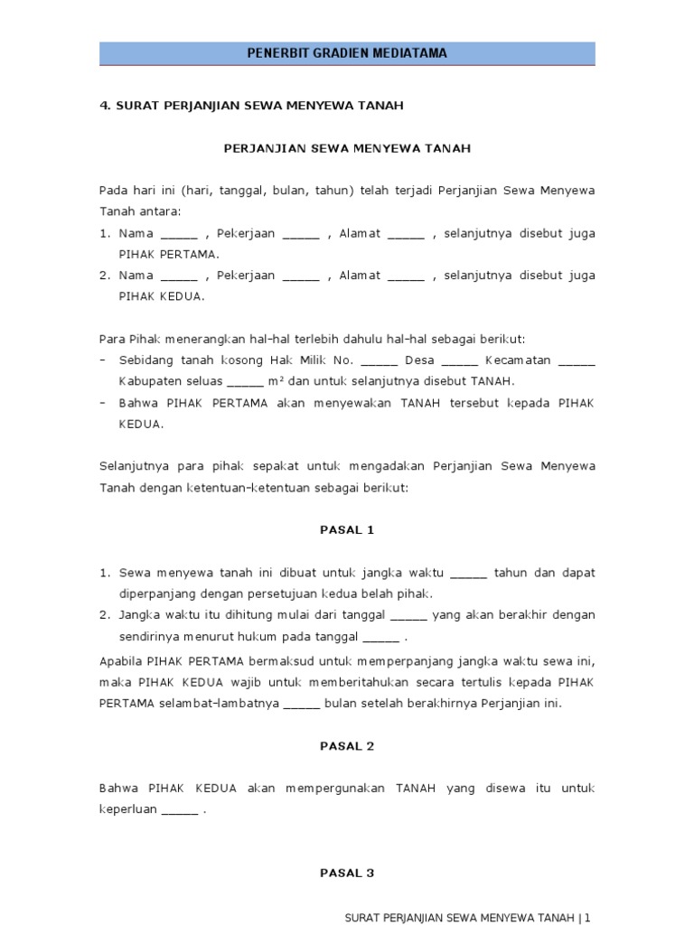 Contoh surat perjanjian sewa menyewa tanah yang resmi format word. Surat perjanjian sewa tanah merupakan bukti utama yang harus dimiliki saat melakukan proses sewa menyewa lahan. Seperti surat perjanjian lainnya, surat ini begitu penting dalam proses sewa menyewa.