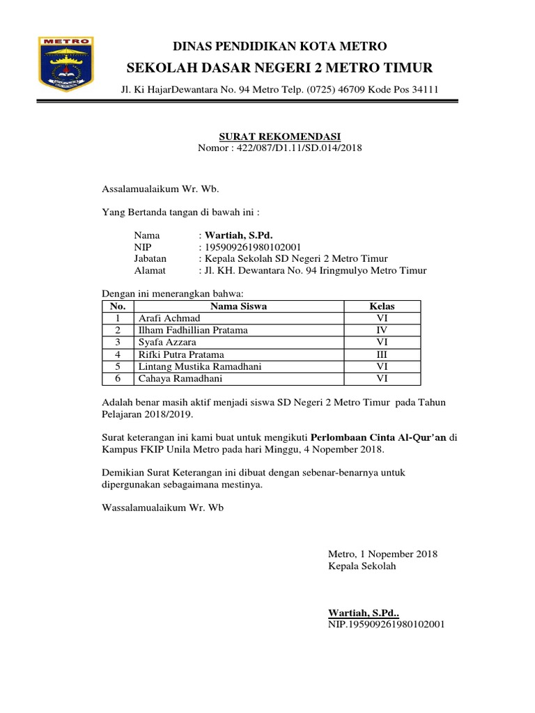 Contoh Surat Rekomendasi Kepala Sekolah Mengikuti Lomba - Revisi Id