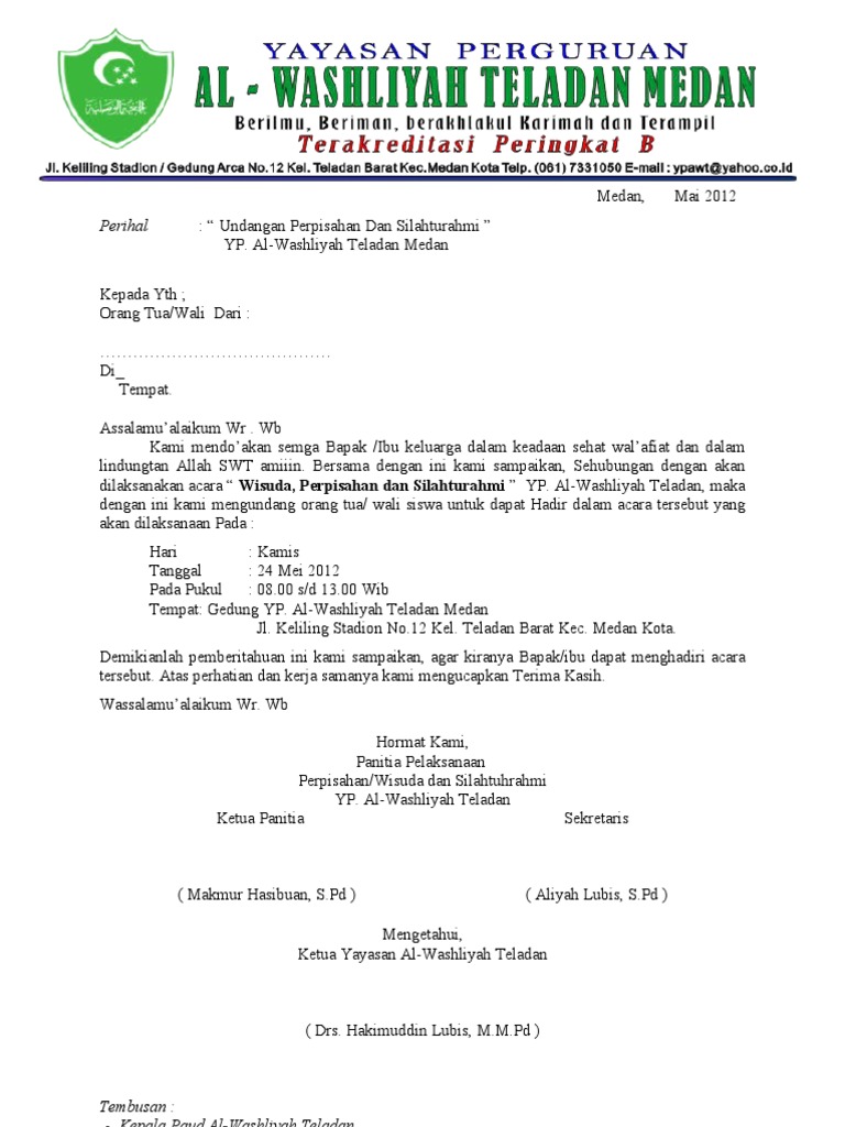 Perpisahan / pelepasan siswa, yang insya allah akan dilaksanakan pada: Demikianlah surat undangan ini dari kami. Surat resmi perpisahan sekolah surat ras format 1600 x 1019.