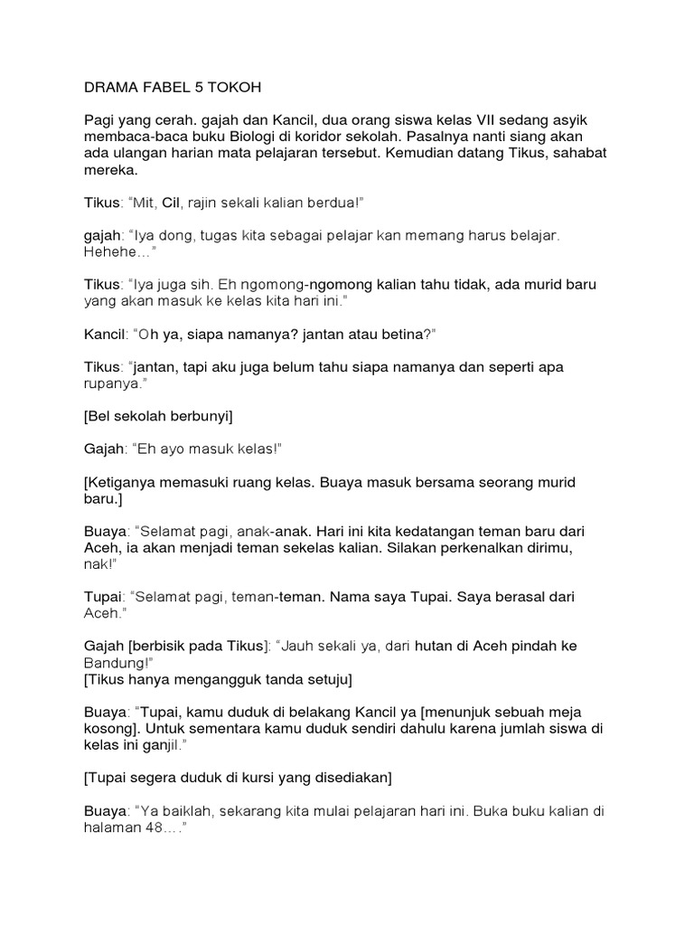 Cerita imaginasi, puisi rakyat, fabel, puisi, drama, cerpen, cerita inspirasi, teks anekdot, teks hikayat, dan novel Contoh naskah drama fabel september 1 april 3 maret 5 januari 5 ngarep school la n y ca. Cerita fabel merupakan cerita binatang yang berperilaku menyerupai manusia.