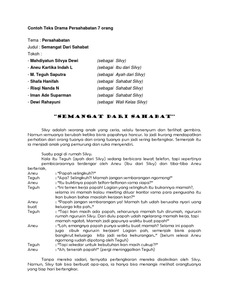 Disana tedapat sebuah persahabatan yang bernama the friend, beranggotakan tiga pelajar populer yang bernama coki, cerie, dan canera. Ketiga orang ini baik, pintar dan ramah. Teks drama 7 orang tema persahabatan docx document.