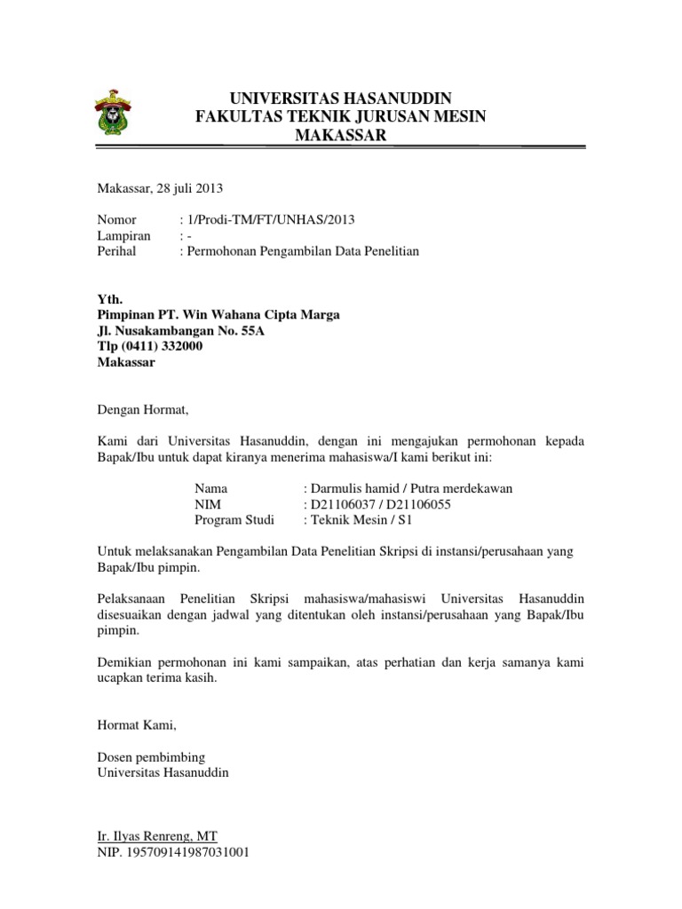 Contoh Permohonan Surat Penelitian Tugas Akhir Universitas