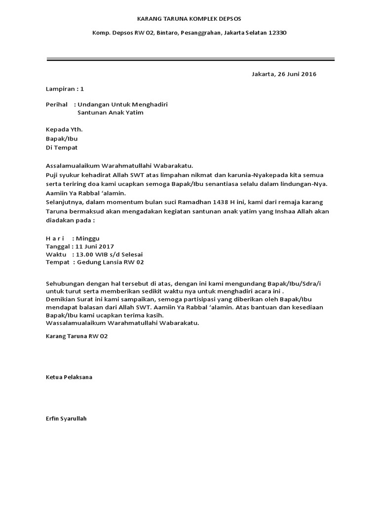 Contoh surat undangan santunan anak yatim kumpulan format 546 x 593. Proposal bantuan dana untuk santunan anak yatim. Jakarta, 26 juni 2016 lampiran :