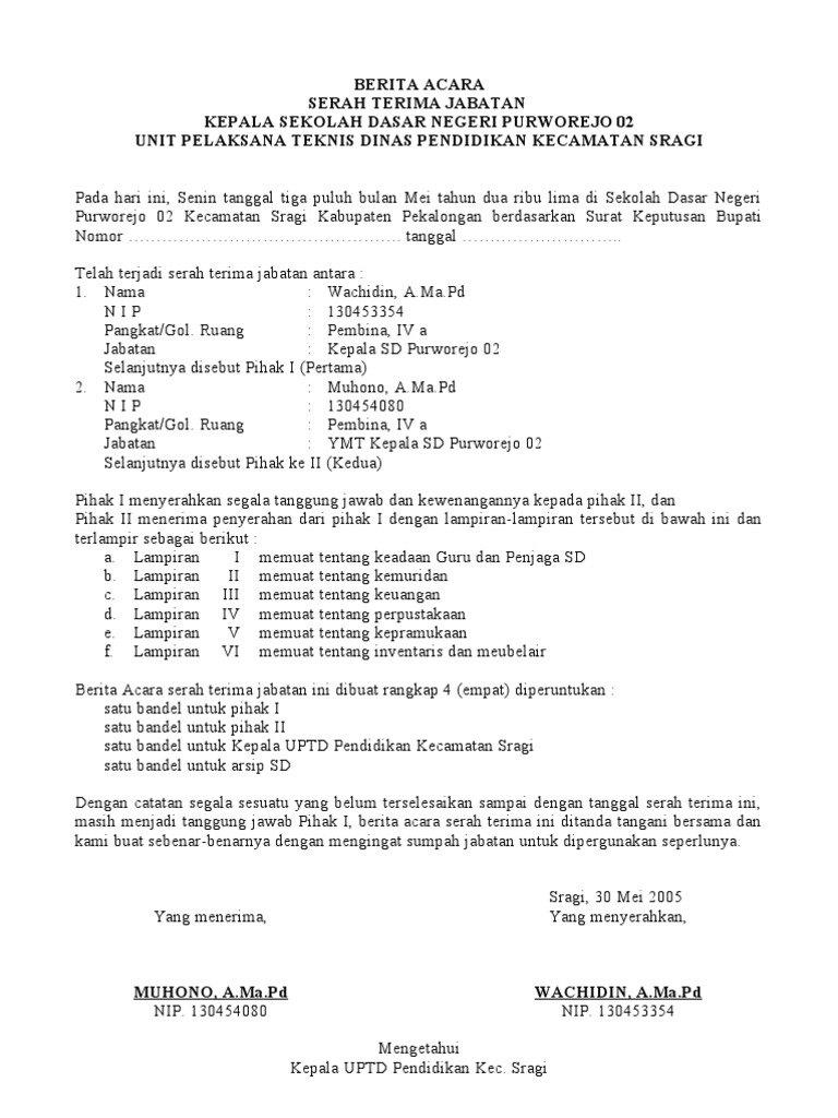 Lihat contoh surat serah terima jabatan kepala sekolah 1653 x 2339 pixel download contoh berita. Lihat juga tentang surat dan contoh surat serah terima jabatan kepala sekolah a dusun b desa c kecamatan d 24356 berita acara serah terima jabatan kepala sd negeri a tahun 2018 pada hari ini. Kecamatan sragi pada hari ini, senin tanggal tiga puluh bulan mei tahun dua ribu lima di sekolah dasar negeri purworejo 02 kecamatan sragi kabupaten pekalongan berdasarkan surat keputusan bupati nomor.
