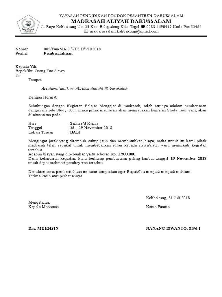 Surat Pemberitahuan Kegiatan Study Tour 2018 Pdf