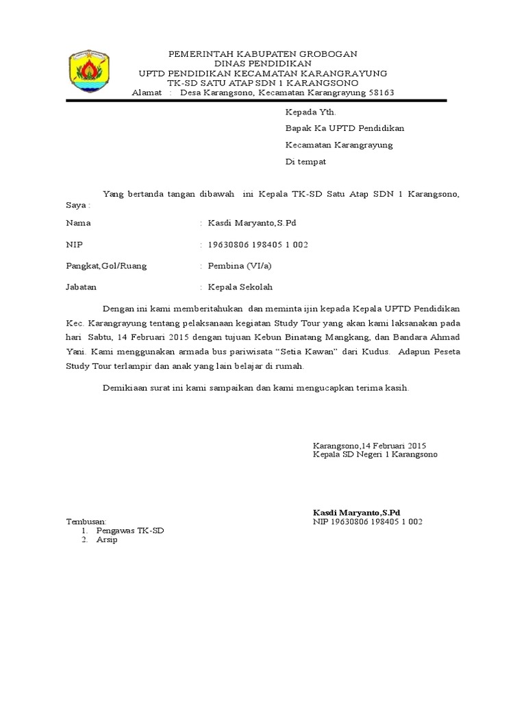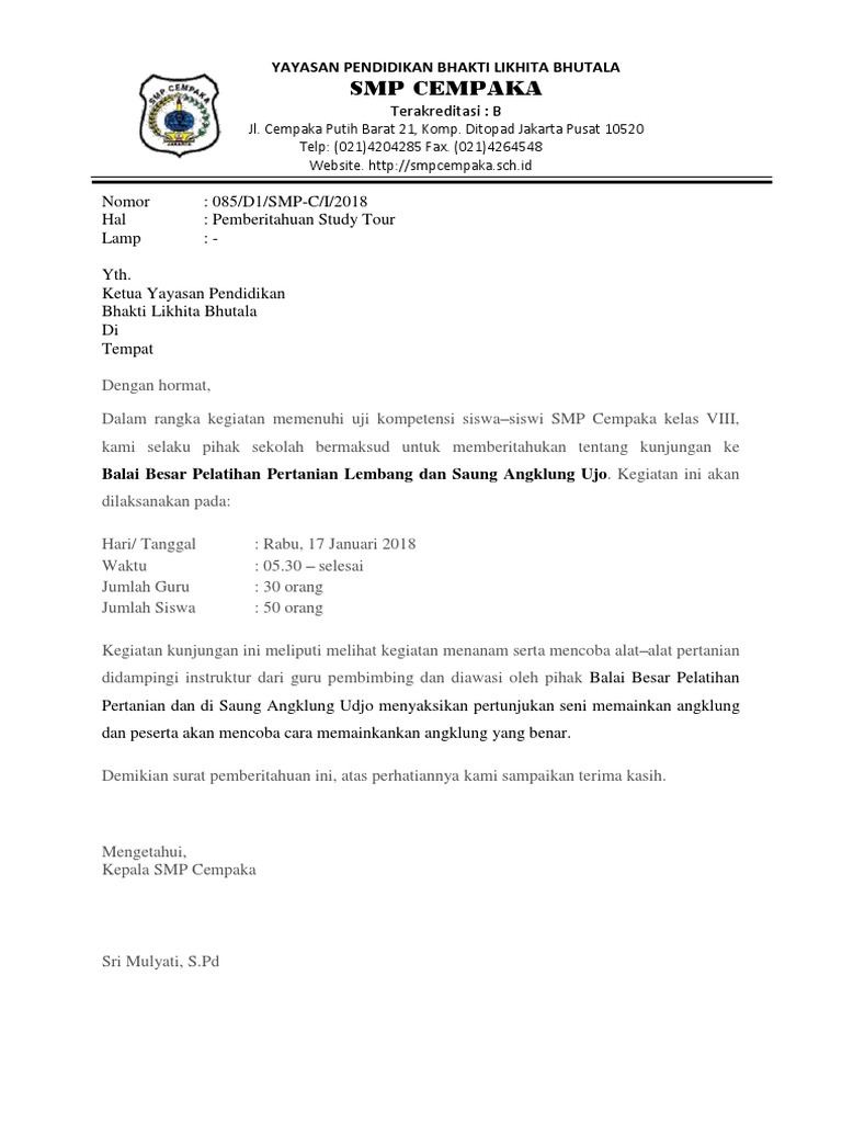Cara membuat surat resmi yang baik dan benar di microsoft word adalah. Berbicara study tour pada postingan ini saya akan berbagi administrasi sekolah terbaru yakni contoh surat pemberitahuan study tour tahun 2018 yang bisa anda unduh secara gratis. Contoh surat resmi sekolah setiap komunikasi sekolah yang bersifat resmi biasanya akan.surat permohonan izin jalan karya wisata sd negeri pintu gobang kari nomor untuk menyelenggarakan darma wisata karya wisata siswa ke bukit.setiap akan melaksanakan study tour, maka panitia terlebih dahulu harus membuat surat pemberitahuan kegiatan.