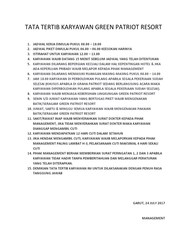 Demikianlah beberapa ulasan artikel tentang contoh peraturan tata tertib cafe yang dapat anda jadikan referensi untuk mengetahui lebih jauh mengenai contoh peraturan tata tertib cafe. Pekerjaan yang akan diserahkan oleh pihak pertama kepada pihak kedua adalah pekerjaan sebagai karyawan pt. Datang tepat waktu pukul 08.00 wib (bila terlambat/ ijin via sms/telpon) 2.