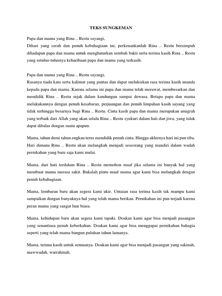 Teks sungkeman sedih perpisahan sekolah. Mangga kasép, geulis geura ingkah tina lahunan mamah ngalih kana panggonan bapaprak tumamprak, rep sidakep, sir budi cita rasa. Belajar mc nikah teks pembawa acara saat sungkeman kepada orang tua dan mertua youtube belajar teks penuaan